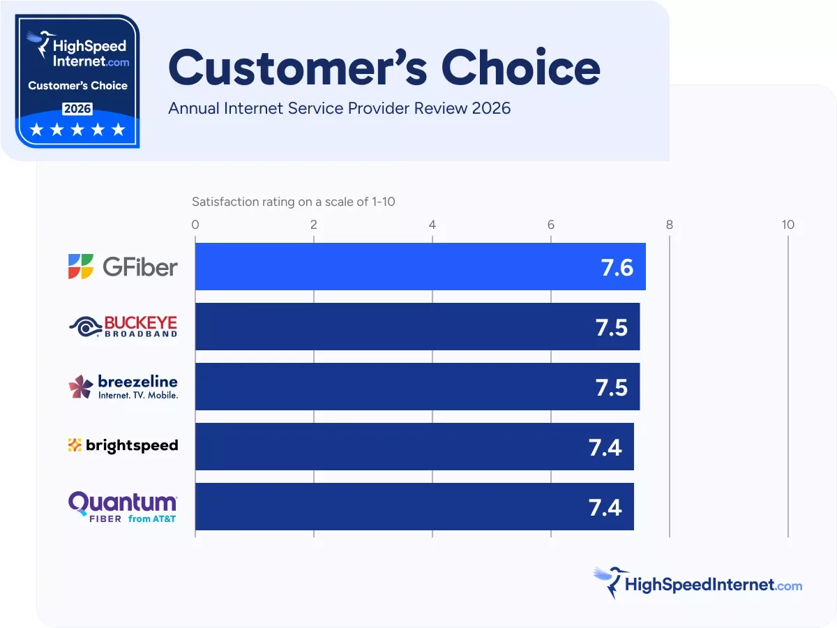 Google Fiber is always fast and improving. So we weren’t surprised by its phenomenal 287Mbps average speeds this year, making it one of the country’s fastest ISPs, yet again. Google Fiber’s network consistently produces positive customer feedback, usually the best customer feedback we see all year. In 2026, Google Fiber customers again rated their experiences exceptionally high in every category.