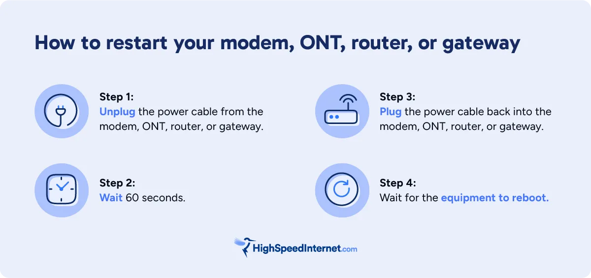 Restarting your equipment is always the first step to solving internet problems. This fix is capable of solving a wide range of common internet issues, and it’s super easy.
